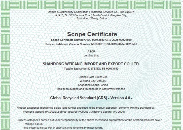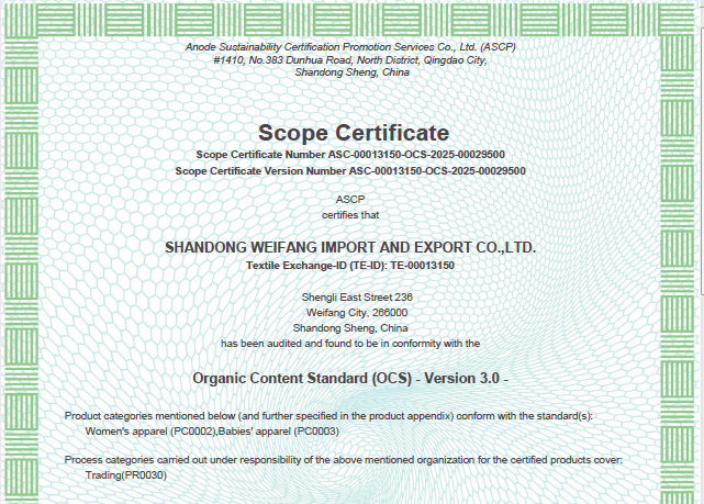 公司自營和代理服裝、食品、五金、化工、機電等各類商品及技術(shù)的進出口業(yè)務(wù),公司有專門的生產(chǎn)、加工基地,并通過了Oeko - Tex Standard 100、GRS、OCS、RCS、USCTP等多項認證,可以按客戶要求設(shè)計生產(chǎn),同時承辦中外合資經(jīng)營、合作生產(chǎn)、開展“三來一補”以及技術(shù)輸出、易貨、邊境貿(mào)易等業(yè)務(wù)。公司產(chǎn)品出口到日本、法國、俄羅斯等50多個國家或地區(qū)。